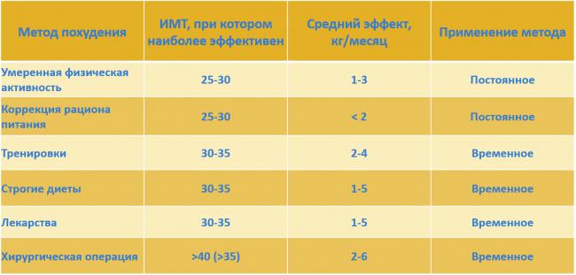 В этом обзоре описываются основные методы похудения, их преимущества и недостатки. Рассмотрены строгие диеты, коррекция рациона питания, тренировки, умеренная физическая активность, лекарства и БАДы, хирургическая операция. И в заключение дается таблица, в которой сведены ключевые данные по рассмотренным методам похудения. Строгие диеты Понятно, что только классификация и перечисление различных диет могли бы с избытком заполнить эту статью. Но мы постараемся подвести их под одну гребенку. В целом диеты опираются на простой механизм: за счет снижения калорийности пищи потребности организма в энергии начинают удовлетворяться за счет накопленных ранее жиров. В итоге избыточный вес начинает уменьшаться. А множество различий между диетами проявляется в том, на что делается ставка (углеводы, жиры, белки, конкретные виды продуктов и т.д.). В интернете размещаются данные о наиболее эффективных диетах, выявленных в ходе сравнительных исследований. Насколько стоит доверять этим данным – вопрос открытый. В частности, потому, что нередко в исследованиях не учитывается такой важный параметр как долгосрочность снижения веса. В целом строгие диеты плохо подходят для решения задачи долгосрочного и устойчивого снижения веса. И дело чаще не в нашей слабовольности, а в том, что против нас действует физиологический механизм поддержания сложившегося уровня жиров в организме, активизируемый при интенсивном снижении веса. В то же время работающие диеты могут подойти для быстрого улучшения своих кондиций на некоторое время, под ситуативную потребность. Или вы можете постараться удержать достигнутый с помощью диеты вес, хотя это и непростая задача. Также, соблюдение назначенной врачом диеты может быть необходимым людям с ожирением. Преимущества При условии строгого соблюдения диеты можно за небольшой период времени существенно снизить свой вес и даже привести фигуру в норму. Так, вы можете подтянуть фигуру к летнему сезону или важному событию (юбилей, свадьба и т.п.). Даются четкие инструкции, когда, чего и сколько следует есть и пить. Это способствует соблюдению диеты и получению нужного результата. Недостатки Как правило, в дальнейшем достигнутый вес тела не удается удержать, и он возвращается к изначальной величине, а то даже и еще больше «нагуливается». По данным зарубежных исследований, такое происходит с 80-90% похудевших на диете. Отмечается неблагоприятное, а иногда даже опасное, влияние большинства диет на наше здоровье (недополучение нужных нутриентов из-за несбалансированного рациона питания, проблемы с ЖКТ и др.). Для людей с ожирением (ИМТ