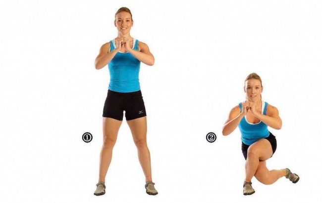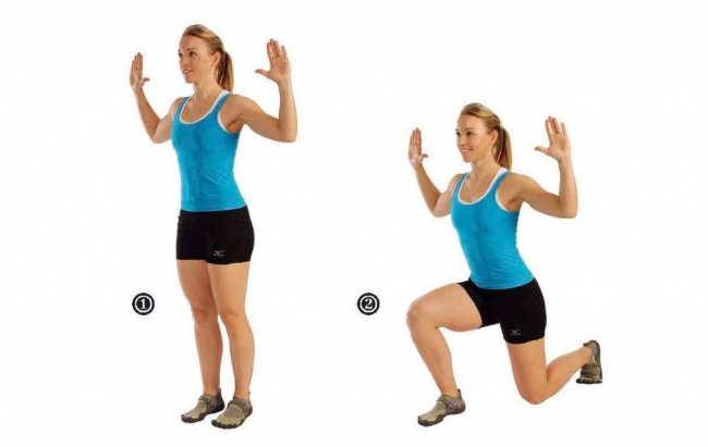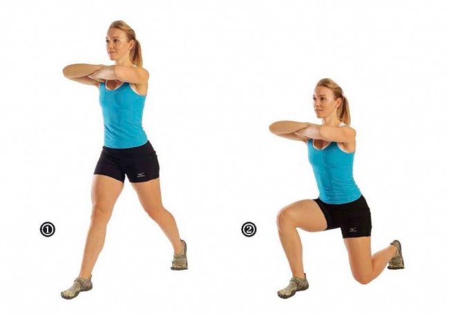 Повышает гибкость тазобедренных суставов и укрепляет бедра. Встаньте, поставив ноги на ширине плеч и скрестите руки на груди. Сделайте шаг вперед. Сгибайте переднюю ногу, пока бедро не будет параллельно полу. Заднее колено почти касается пола. Вернитесь в вертикальное положение и выполните движение другой ногой. Зафиксируйте удаленную точку – это поможет при сохранении равновесия. Колени в согнутом положении не должны выступать за пальцы ног.