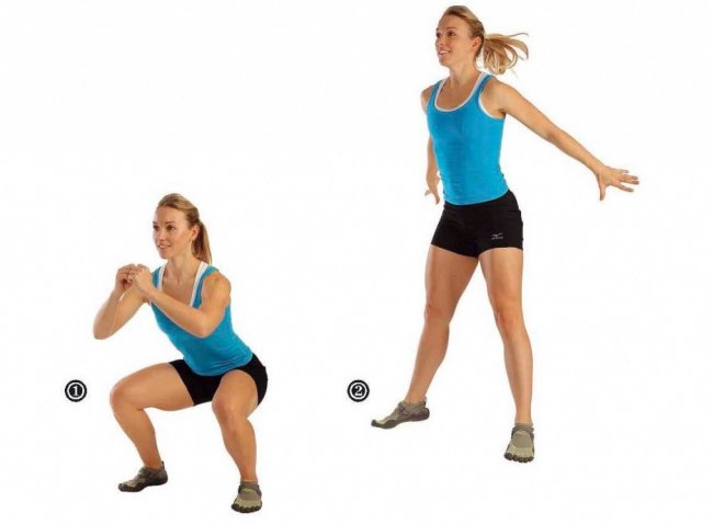 Для скорости, выносливости и хорошей физической формы. Ноги немного шире плеч. Вес тела переносится на всю поверхность стоп. Носки смотрят в ту же сторону, что и колени. Взгляд направлен прямо, спина прямая, руки перед грудью. Теперь быстро опускайте таз до параллели бедер с полом. Затем резко подпрыгните, вытянув руки назад, и закончите прыжок, слегка согнув колени. При подпрыгивании постарайтесь полностью распрямить тело в воздухе.