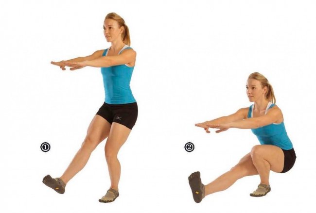 Для гибкости тазобедреных суставов и стабильности коленей. Из положения стоя с ногами на ширине плеч сделайте левой ногой шаг с выпадом влево. Спина прямая, взгляд направлен вперед. Руки вытянуты вперед. Теперь сгибайте левое колено, пока бедро не будет параллельно полу. Стопы остаются на полу. При сгибании колена бедро движется вперед. Вернитесь исходную позицию и повторите упражнение правой ногой. Помните о том, что обе стопы должны оставаться на полу. Вытянутые вперед руки помогут сохранить равновесие.