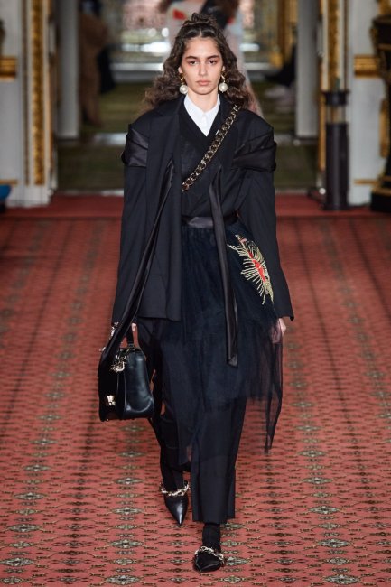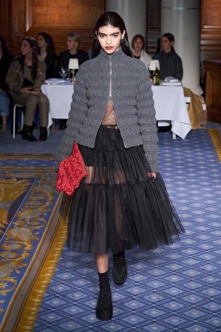 Отсылки к модным пышным юбкам из фатина появились еще в сериале "Убивая Еву" – там самым ярким образом серийной убийцы Вилланель, которая не представляет своей жизни без модных вещей, стало розовое платье с воздушной фатиновой юбкой Molly Goddard. Этот образ покорил сердца девушек по всему миру и стал один из знаковых нарядов в нашумевшем сериале. Этой осенью Molly Goddard остались верны своим главным кодам – сочетанию романтичных силуэтов с дерзкими элементами. Так, на подиуме появились черные многослойные полупрозрачные юбки в паре с вязаными кардиганами и уютными полосатыми свитерами. Объемные драматические варианты воспели также Simona Rocha – бренд показал как сочетать брючные костюмы с юбками этой осенью. Не совсем практичный стилистический прием, но зато нетривиальный и эффектный.