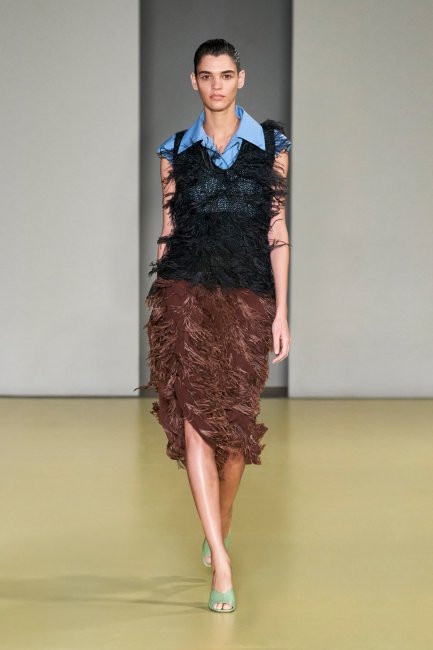 ChanelВ новом 2021 году помимо дерзких мини-юбок будут в тренде модели с перьями. Гламурный тренд на фееричные, эпатажные и романтичные перья вновь вернулся, а значит в новом году будет больше поводов наряжаться и выходить в свет. В коллекции No.21 перья напоминали тончайшую бахрому, расположившуюся на юбках и платьях бренда, Salvatore Ferragamo сделали ставку на шоколадные пучки, украсившие юбки и брюки, а Fendi показали пушистые белоснежные юбки, напоминающие воздушное облако.