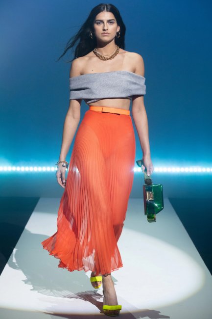 Tod'sGivenchyMiu MiuОсобенно эффектными в весенне-летних коллекциях стали всевозможные комбинации с оттенками фиолетового, красного и зеленого. Так, пастельный фиалковый можно увидеть у Tod's - сочетать его бренд предлагает с яркими "бананами" морковного цвета и кожаной баской, ультрапопулярным элементом гардероба в текущем сезоне. Пыльный лавандовый показали Givenchy, добавив к нему шелковый асимметричный топ-халтер, а Miu Miu сделали ставку на комбо ярких сиреневого и бирюзового. Еще одним удачным цветом для новых стилистических открытий станет красный и все его тонкие переливы: будь то морковная юбка-плиссе, как у Brandon Maxwell, алые брюки-палаццо, как у Fendi, или красная водолазка с вырезами, как у Prada. Комбинировать этот яркий цвет советуем с серым, небесно-голубым, желтым и розовым.