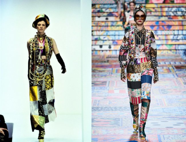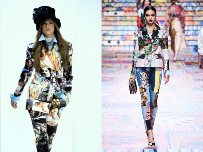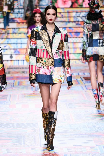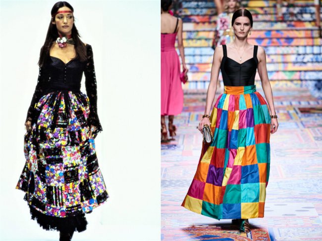 Dolce & Gabbana весна-лето 2021Отдельно стоит рассказать и о пэтчворке, который стал главной техникой этой коллекции. Доменико Дольче и Стефано Габбана удалось избежать хиппи-ассоциаций, которые неразрывно с ней связаны, а преподнести эту трудоемкую работу с размахом и богемным настроением. Здесь им на помошь опять же пришли собственные архивы, а именно коллекция 1993 года. Ищем параллели.