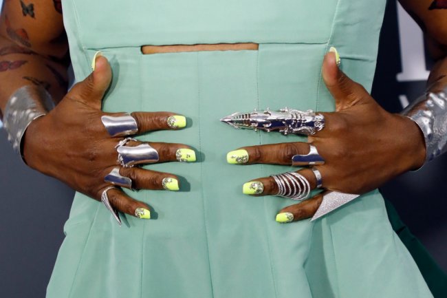 Билли Портер в комбинезоне Hogan McLaughlinОбраз Билли Портера дополнили неоново-желтый маникюр и массивные серебристые украшения – браслеты, кольца и колье. Завещающими штрихами стали золотая металлическая подводка и сверкающий серебристо-синий бальзам для губ от звездного визажиста Пэт Макграт.