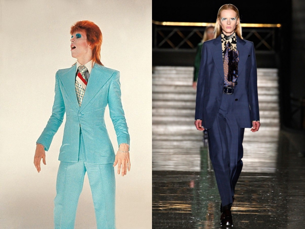 Сочетание брючного костюма с глянцевым блеском и сорочки с графичным принтом из коллекции Miu Miu осень-зима 2012/2013 покорило не одно модное сердце, но истинные поклонники певца узнали в этих образах героя Дэвида Боуи из клипа "Есть жизнь на Марсе?". Причем, главной подсказкой для них стал макияж глаз моделей - их веки были покрыты плотным слоем ярко-голубых теней.