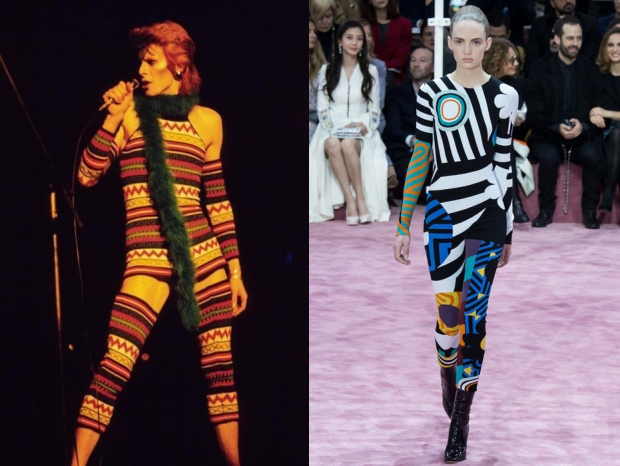 Будучи креативным директором Christian Dior,дизайнер Раф Симонс не раз ломал стереотипы и вокруг своего творческого почерка, так и о ДНК вверенного ему модного Дома. Однако появление на кутюрном шоу моделей в облегающих трикотажных комбинезонах с пестрыми принтами, в которых часто появлялся на сцене Дэвид Боуи, имело эффект разорвавшейся бомбы. Эти броские и даже эпатажные вещи мгновенно стали популярными у модных стилистов, заполонив страницы глянцевых журналов.