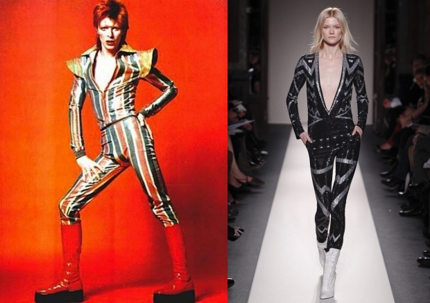 Образ Зигги Стардаста, вымышленного сценического персонажа Боуи, действовал на модных дизайнеров гипнотически, особенно тех, кто рос под его музыку в семидесятых. Так, в 2011 году известный своей любовью к рок-н-роллу Кристофер Декарнен, на тот момент креативный директор Balmain, представил коллекцию, лицом которой вполне мог стать Зигги Стардаст.