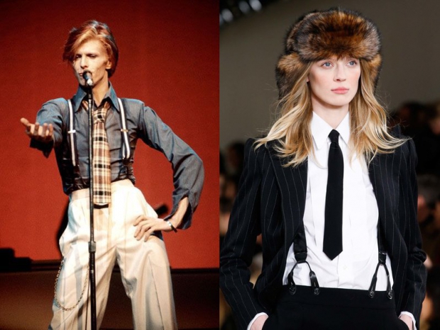 Что может быть общего у авангардного Дэвида Боуи и приверженца вечных ценностей Ральфа Лорена? Однако один из ключевых образов бренда - широкая сорочка, заправленная в свободные брюки, подтяжки с застежками-клипсами и галстук - нередко выбирал и британский певец.
