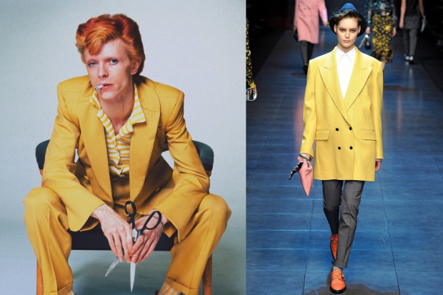 Еще один культовый образ Боуи в ярко-желтом костюме частично был повторен в 2011 году в коллекции итальянского дуэта Dolce & Gabbana. На фоне кружевных летящих платьев этот лук выглядел весьма неожиданным и тем самым еще более пикантным.