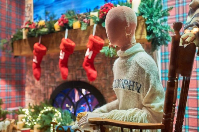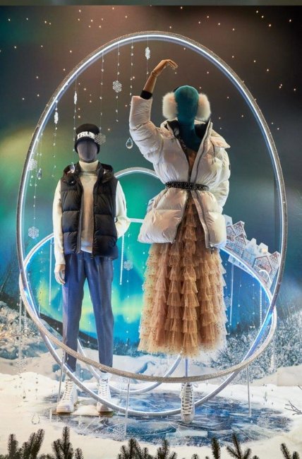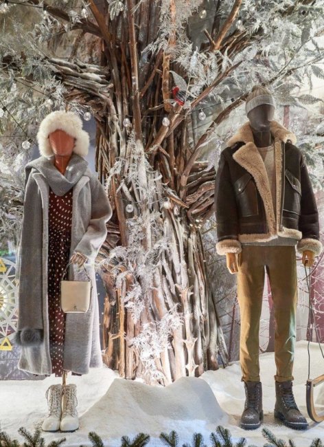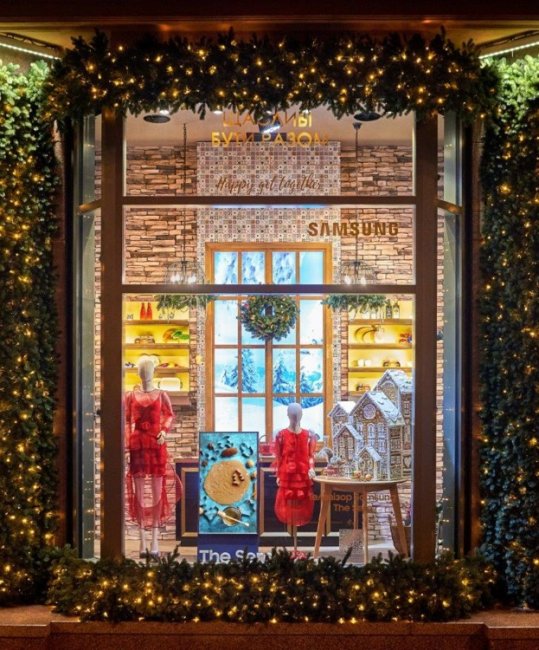 Классическая цветовая гамма декораций с натуральными оттенками дерева и терракота, фактурные материалы и текстуры переносят зрителя в теплую атмосферу Рождества и предновогодних торжеств. Концепция «Счастливы быть вместе» нашла свое отражение в традиционных сюжетах, которые напоминают о домашнем уюте: семейный ужин, украшение елки, каток, приготовление праздничного печенья, прогулка по заснеженному парку, досуг в кругу родных. В витринах использованы световые эффекты и елочный декор, а также установлены механизированные фигурки животных винтажного стиля, которые специально были заказаны во Франции.