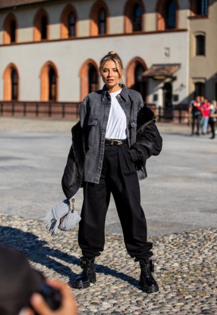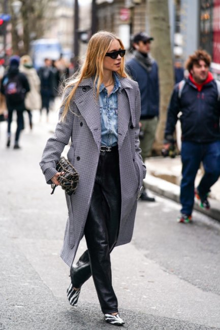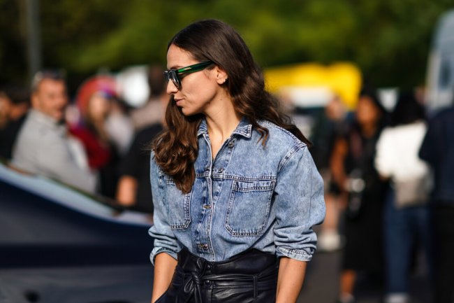 Немало внимания дизайнеры уделили коже в коллекциях сезона осень-зима 2020/2021. Остается она актуальной и будущей весной. Комбинация удлиненной джинсовой рубашки с акцентом на линии плеч или блузы из денима с отложным воротником, как у Матильды Гелер, и черных кожаных брюк или шорт станет выигрышным вариантом для любого повода.