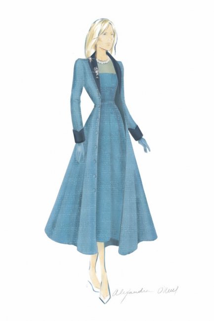 Джо и Джилл Байден на службе в Соборе Святого апостола Матфея"Пальто с темно-синим бархатным воротником и манжетами надевается поверх зауженного платья с шифоновым лифом и юбкой с фестонами», - сказала Александра О’Нил о дизайне наряда - "Вырез платья вручную расшит жемчугом и кристаллами Swarovski, имитируя нежные цветочные узоры. Те же кристаллы украшают пальто, тонко отражая свет".
