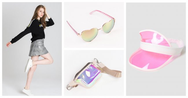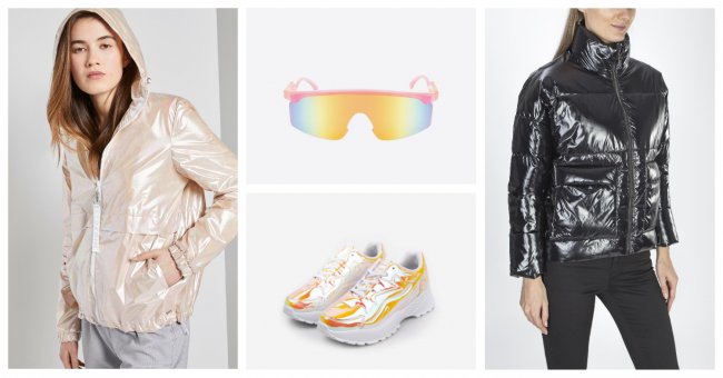 До сих пор воспринимаете голографический стиль только как возможность выделиться на вечеринке? Очень зря. Аксессуары в металлических и электрически-голубых оттенках могут спасти даже самый непримечательный образ. В спортивный комплект из худи и игривой мини-юбки добавим поясную космическую сумку на текстильном ремешке и полупрозрачное кепи. Мало блеска? Возьмите очки с зеленым градиентом. Бренды поддерживают эту идею и предлагают широкий выбор футуристических шоперов, рюкзаков и косметичек.
