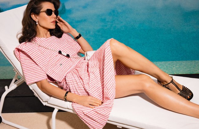 Днем и ночью, в черно-белом или цветном исполнении, у бассейна или в спальни, Шарлотта Казираги воплощает в этом мифическом Монако особую кинематографическую эстетику, которая вдохновила Виржини Виар на создание коллекции.
