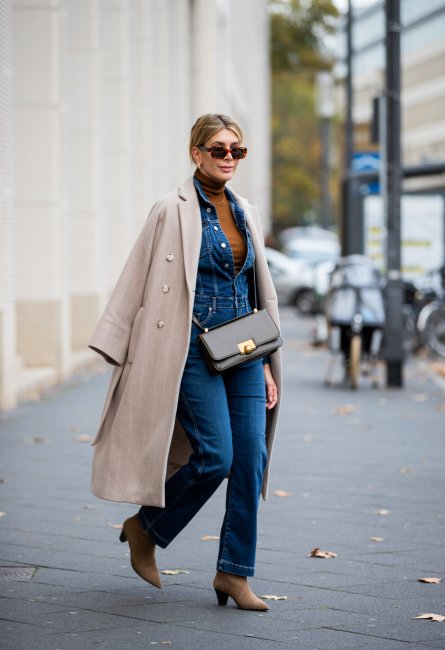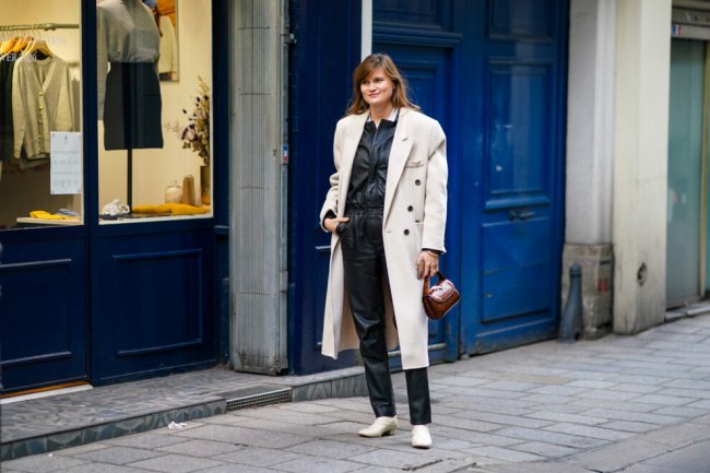 Дюссельдорф, февраль 2021 годаНеделя моды в Нью-Йорке, февраль 2021 годаС комбинезономОсобой любовью в новом сезоне бренды прониклись к комбинезонам из трикотажа или денима – так дизайнеры четко отображают потребность в комфорте в эпоху глобальной пандемии. Именно они и станут отличной базой для бежевых двубортных пальто с графичной линией плеч. Еще один фаворит сезона – кожаные комбинезоны. Дополнить образ советуем обувью пастельных оттенков.