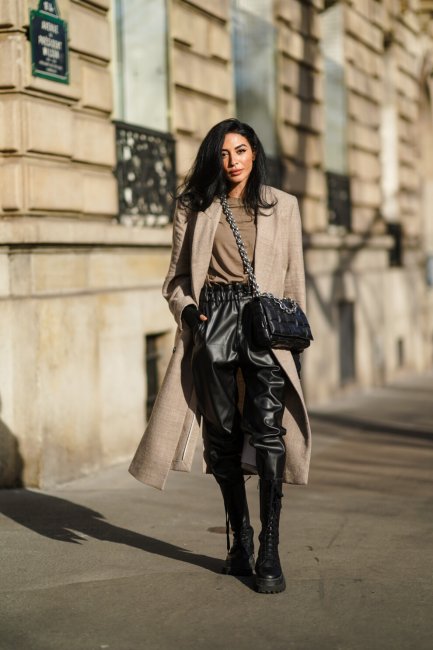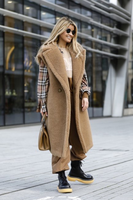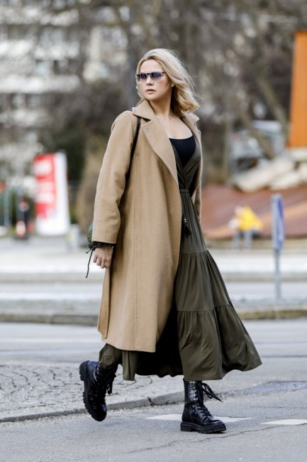 Неделя моды в Париже, октябрь 2020 годаНеделя моды в Стокгольме, февраль 2021 годаС армейскими ботинкамиВысокие ботинки в армейском стиле никогда не покидали модные радары, но в этом году вернулись в тренды с новой силой. Они и станут лучшей обувной партией для классического бежевого пальто длины миди или макси. Такое комбо как нельзя лучше передаст тонкую игру на контрастах - стильная смесь гранжа и элегантности.