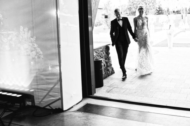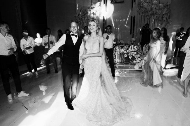 Свадьба Александра Зинченко и Влады СеданНевеста выбрала макияж с акцентом на глаза в карамельно-розовой цветовой гамме и собранные волосы в небрежный пучок. В качестве первого свадебного платья, в котором прошла церемония бракосочетания, стал силуэтный наряд израильского модного Дома Galia Lahav, который называют жемчужиной свадебной моды Тель-Авива.